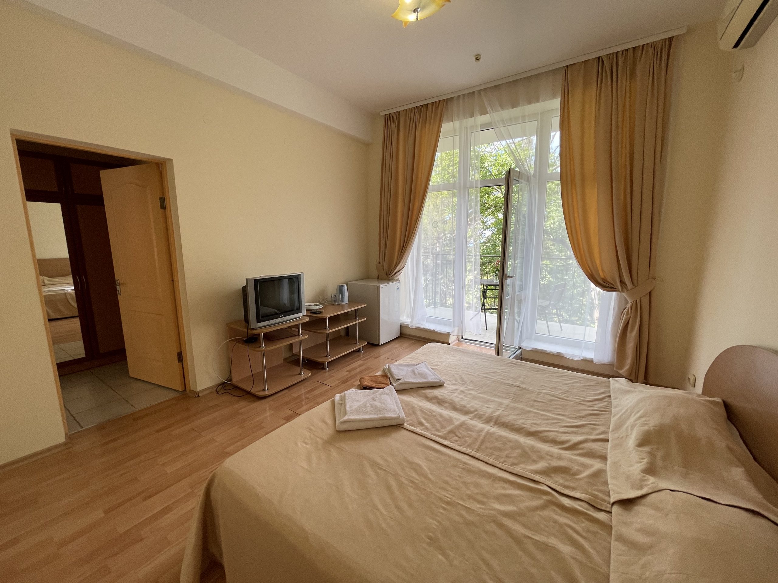Уютный номер с большой кроватью для 2х человек, кондиционером, журнальным столиком, ТВ, холодильником, эл.чайником, набором посуды. Санузел с ванной, унитазом, умывальником. В прихожей шкаф для вещей с зеркалом во весь рост.